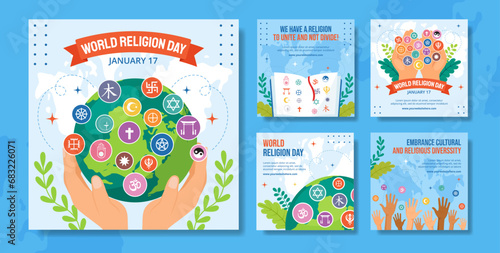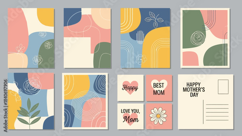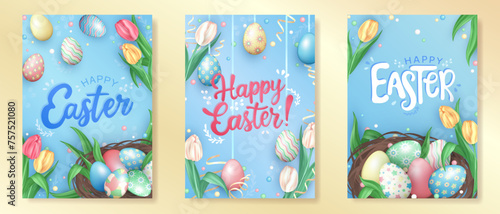 Happy Easter greeting card template with cute design isolated set. Postcard with congratulation text and painted eggs, sweet holiday cake and first spring flower vector illustration