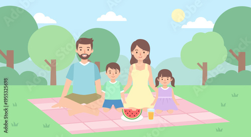 Happy family enjoying summer vacation on beach vector illustration. Man and woman married couple with child rest at seaside of tropical resort cartoon. People activity on holiday