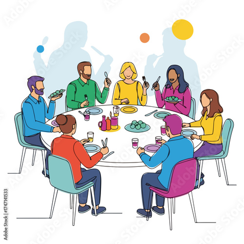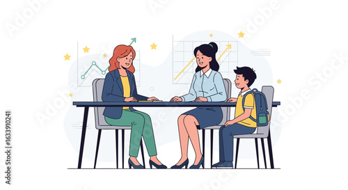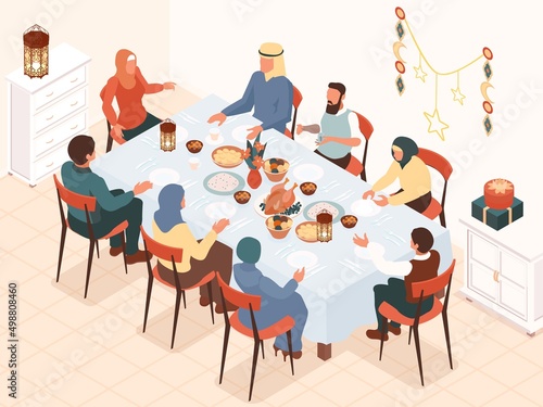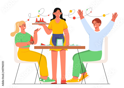 Happy family characters playing board game sitting at table, flat vector illustration. Parents with children spending time together, playing tabletop game and having fun. Home leisure activities.