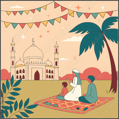 Happy family decorate christmas tree at home vector illustration. Parents with kid prepare house for festive season. Family celebrate winter holidays and xmas at home. Decorated house interior.