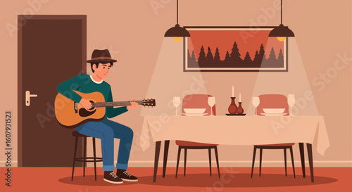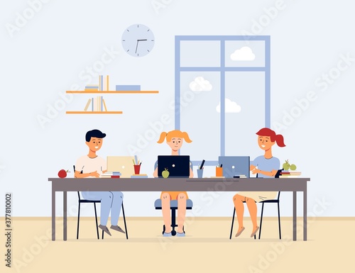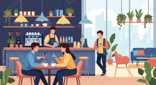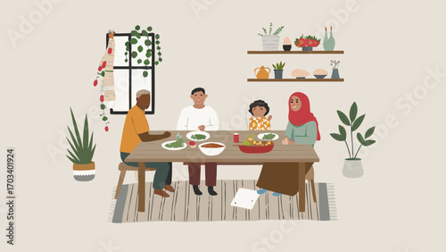 Happy family having breakfast at home in the kitchen. Modern kitchen interior hand drawn vector illustration. Cooking area with dining table in scandinavian cartoon style. Cozy hygge design.
