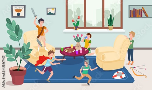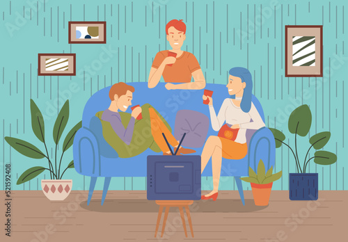 Happy family playing board game together sitting on the floor in living room, flat vector illustration. Parents with kids enjoying free time with playing tabletop game at home. Family relationship.