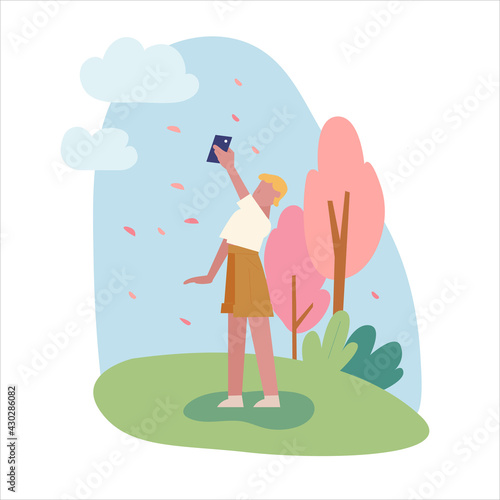 Happy family walking in a park with kid. Vector illustration in paper art origami style. Happy mother and father day poster. Paper cut craft design