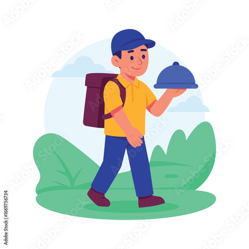Happy father and son going hiking together, flat vector illustration. Family characters trekking, traveling with backpacks. Parent child relationship, happy fatherhood and parenting. Outdoor activity.