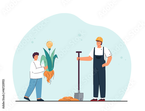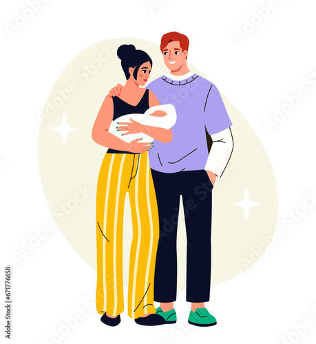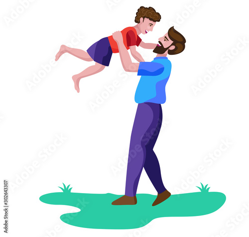 Happy father carrying son on hands vector illustration. Parent holding child in arms while walking in city park. Loving dad and adorable kid spending time together on weekend