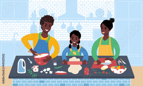 Happy father cooking pancakes with daughter in kitchen, flat vector illustration. Dad with kid spending time together preparing breakfast. Parent child relationship, happy fatherhood and parenting.