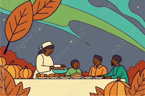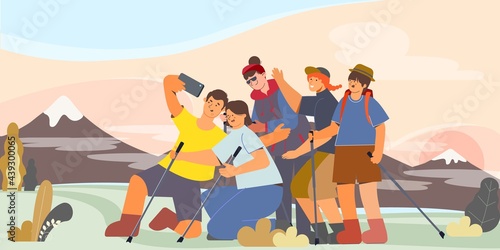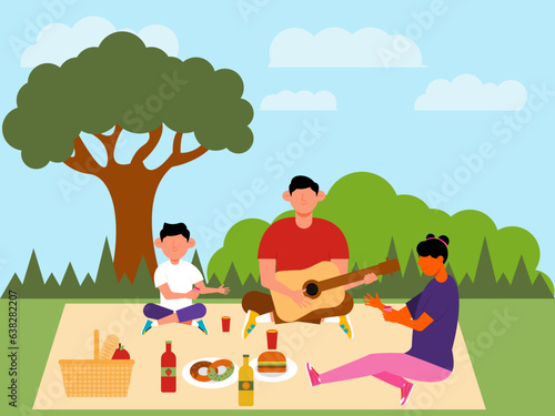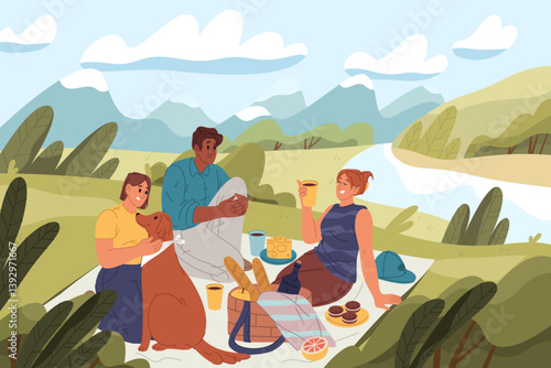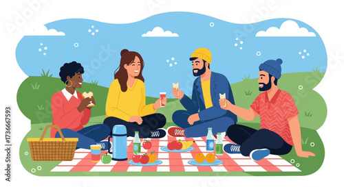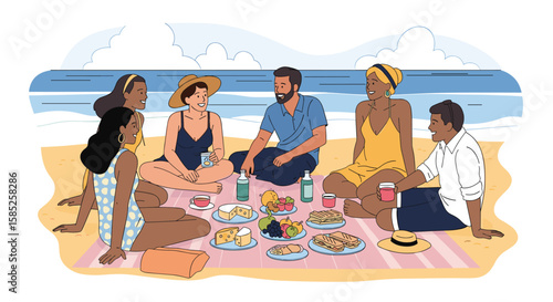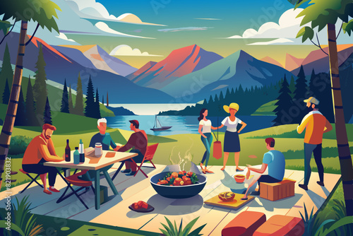 Happy friends enjoying bbq picnic party on terrace vector illustration. Young man and woman grilling barbecue meat, eating salad and drinking beer, talking and sharing positive emotion