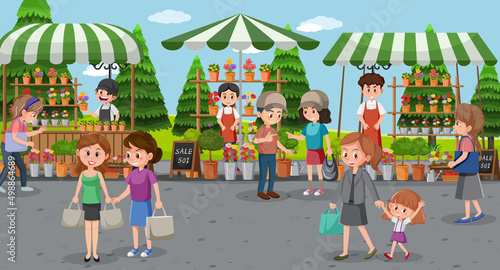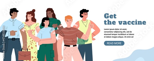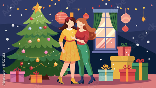 Happy friends standing behind Christmas tree on city street posing for group photo. New Year celebration outdoors vector illustration