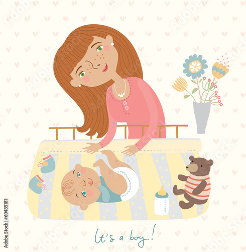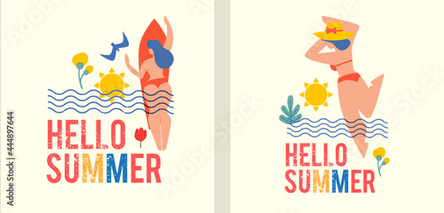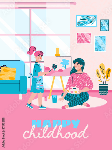 Happy girl blows candles on her birthday cake and enjoy her gifts. Birthday party vector concept illustration. Woman hanging up paper garlands to preparing the birthday party. Web site design.