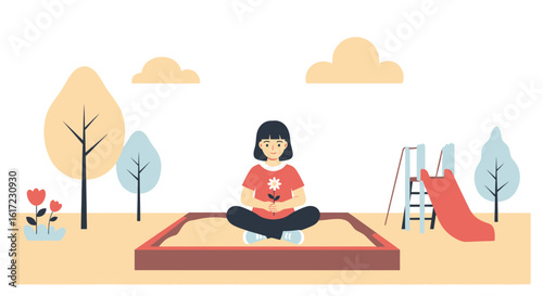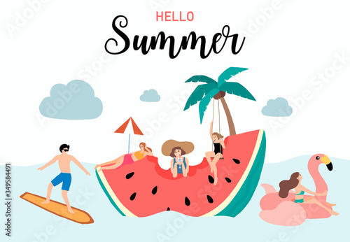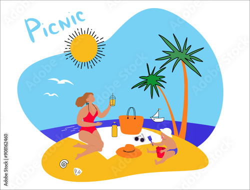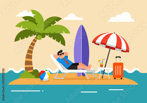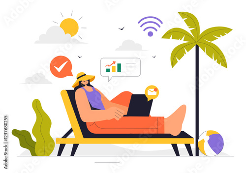 Happy girl, freelancer working on laptop computer sitting on chaise longue on beach, flat vector illustration. Freelance, relax, outdoor remote work, summer vacation.