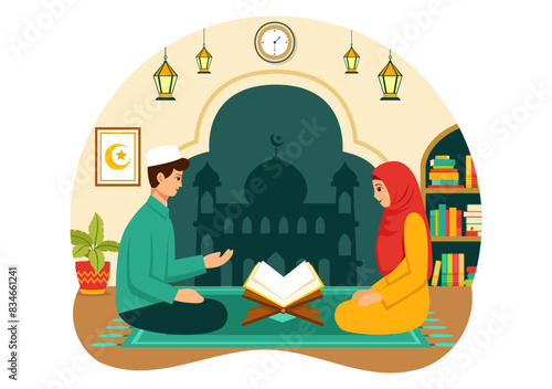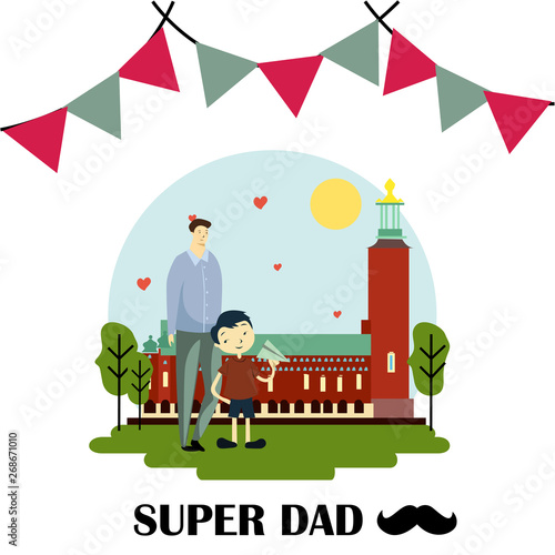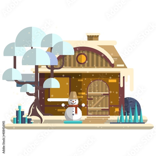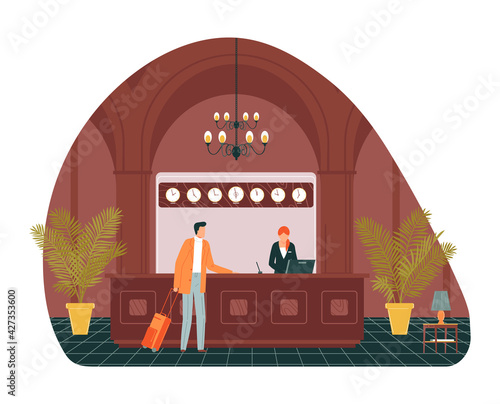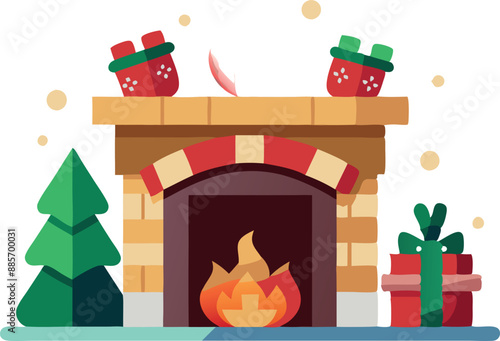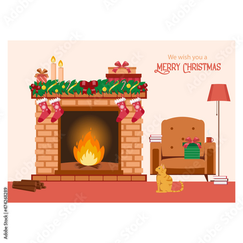 Happy girl putting gift box in Christmas sock, flat vector illustration. Decorated fireplace with Christmas wreath, socks, garland and gifts. Preparation for Xmas, New Year winter holidays celebration