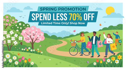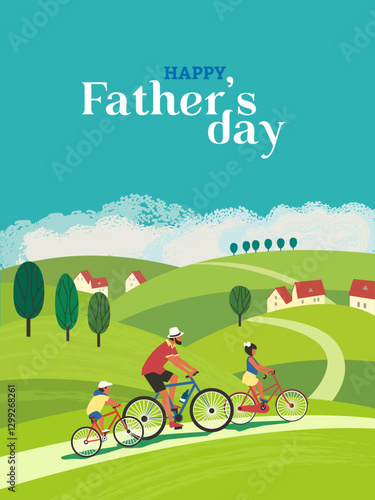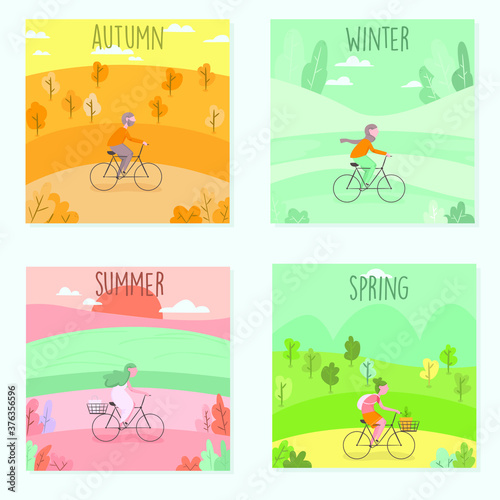 Happy girl riding bicycle on rural road. Outdoor nature landscape. Countryside farm. Woman cycling. Vector web site design template. Landing page website concept illustration