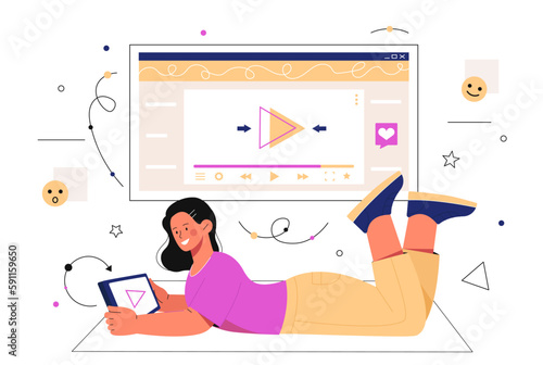 Woman making online payment with credit card, flat vector illustration. Happy girl shopping for clothing, groceries and other goods on the internet using mobile phone. E-commerce, online store.