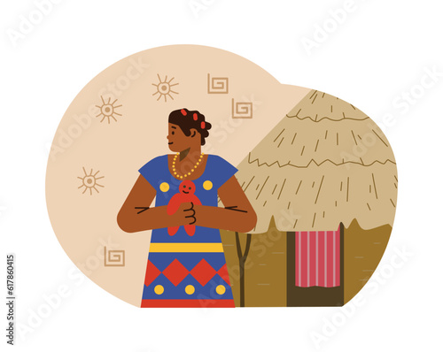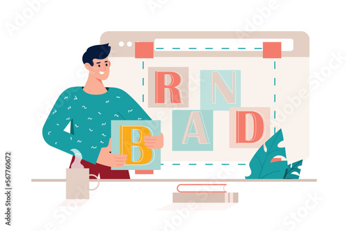 Happy smiling girl shopping for clothes, shoes on the internet using laptop computer, flat vector illustration. Online store, e-commerce, online ordering and delivery.