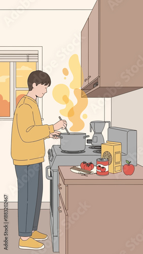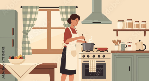 Happy girl sitting at table, eating, drinking coffee and using mobile phone, flat vector illustration. Kitchen interior. Young people lifestyles. Social media and smart phone addiction.