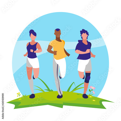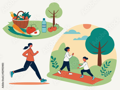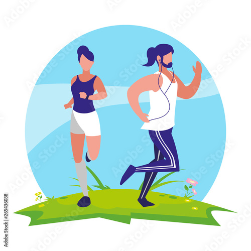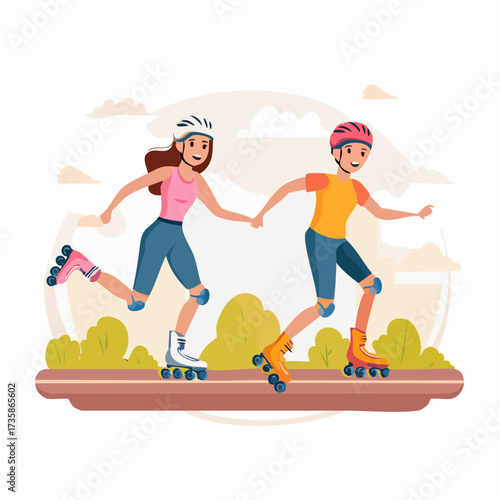 Happy girlfriend and boyfriend teenager characters skateboarding riding down on highway scene. Hipster young couple freestyling boarding outdoor vector illustration