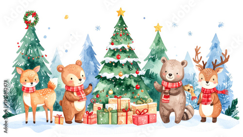 Happy girls celebrating Christmas online, flat vector illustration. Laptop computer and smartphone screens with young women in Santa hats. Online party, video call technologies.