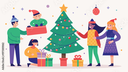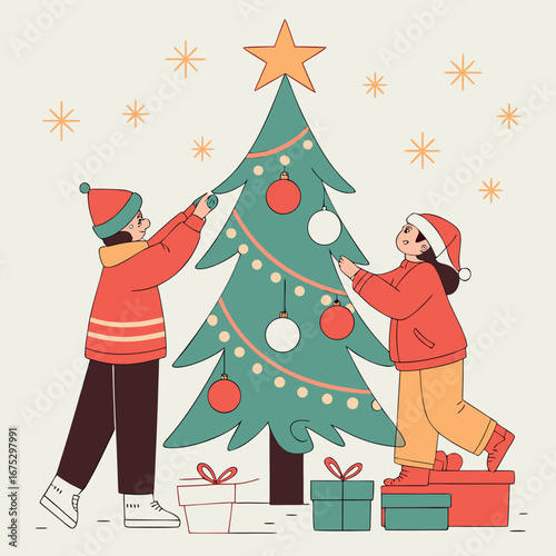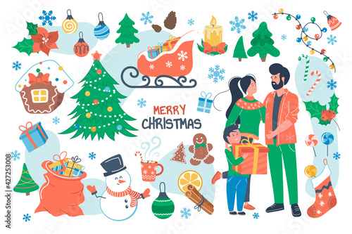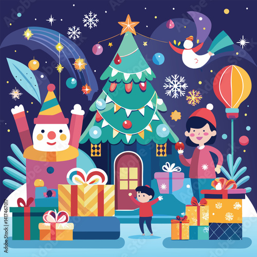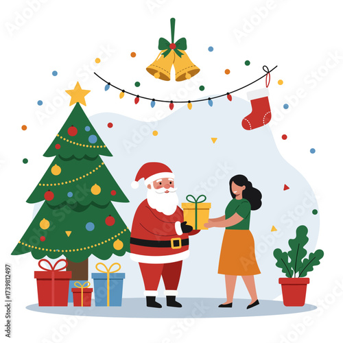 Happy girls celebrating Christmas online, flat vector illustration. Laptop computer and smartphone screens with young women in Santa hats. Online party, video call technologies.