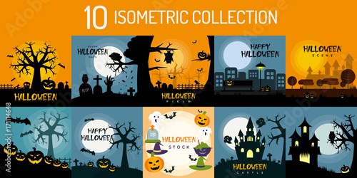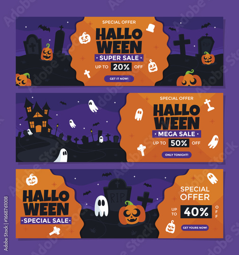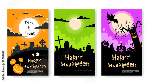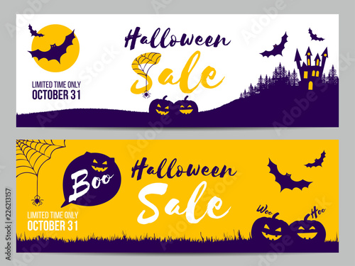 Halloween banner template set, vector illustration in paper art style. Happy Halloween party invitation, sale backgrounds with scary pumpkings, haunted house, bats, cemetery, spiders, dead tree cobweb