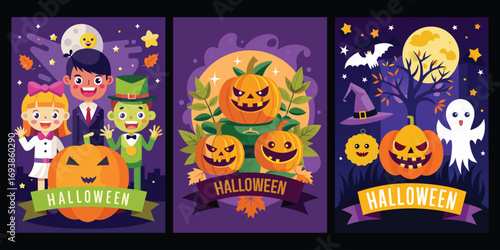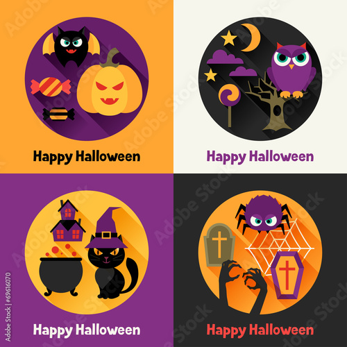 Happy Halloween party invitation greeting card set, vector illustration in paper art style. Paper cut traditional Halloween symbols scary pumpkin, haunted house, flying bats, cemetery, dead tree.