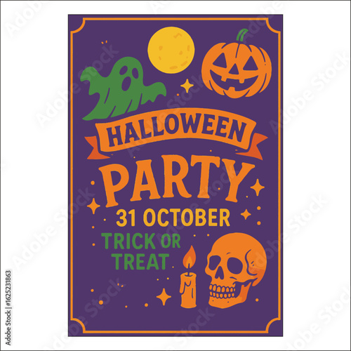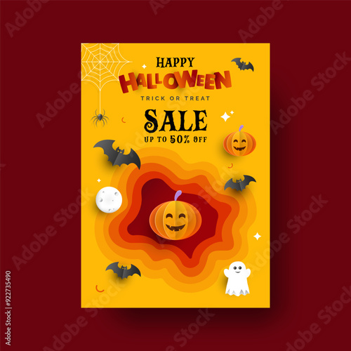 Happy Halloween greeting card with vector graveyard and creepy pumpkin jack-o-lantern illustration. Invitation poster for sale promotion marketing campaign or holiday celebration