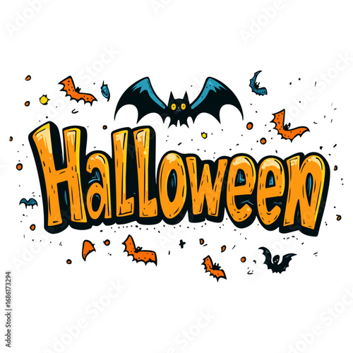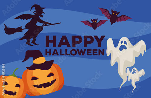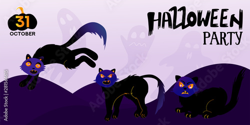 Flying bats, cute Boo ghosts, night background with cemetery with graves and dead tree, vector illustration in paper art style. Happy Halloween composition for party invitation, poster, banner etc.