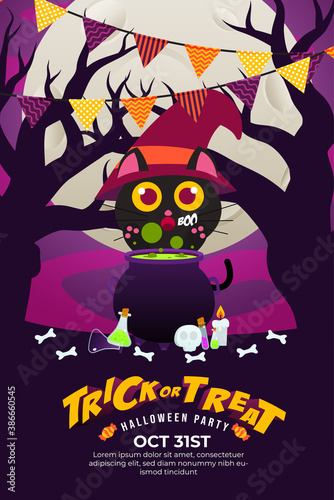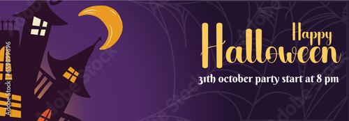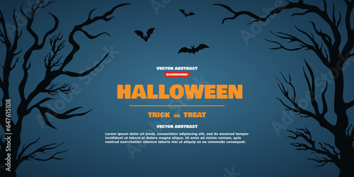 Happy Halloween poster template, vector illustration in paper art style. Halloween traditional symbols full moon, scary pumpkin, haunted house, flying bats, cemetery with graves, dead tree.