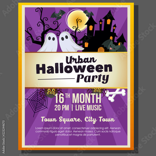 Happy Halloween vector greeting card with spooky castle. Haunted house and flying bat over night sky with moon illustration. Creepy October holiday celebration