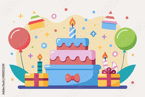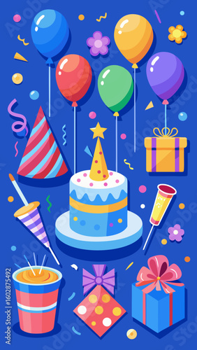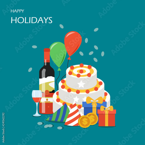 Happy holidays vector flat illustration. Holiday cake and hats, wine, gift boxes, balloons, dollar coins and confetti. Greeting card, celebration poster, banner.