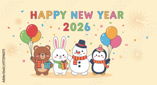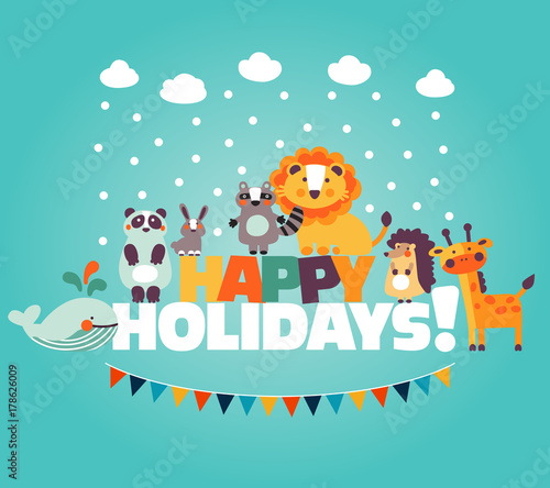 Happy holidays vector flat illustration. Birthday cake with number one, teddy bear, party hats, balloons, gift boxes, baby dummy, dollar coin. First birthday greeting card, celebration poster, banner.