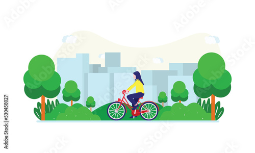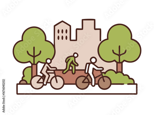 Happy male characters riding bicycle and walking pet dog in city park, vector flat illustration. Active and healthy lifestyle, summer outdoor activities.