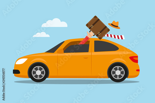 Happy man driving car looking out of window vector icon. Excited male driver character isolated on white background