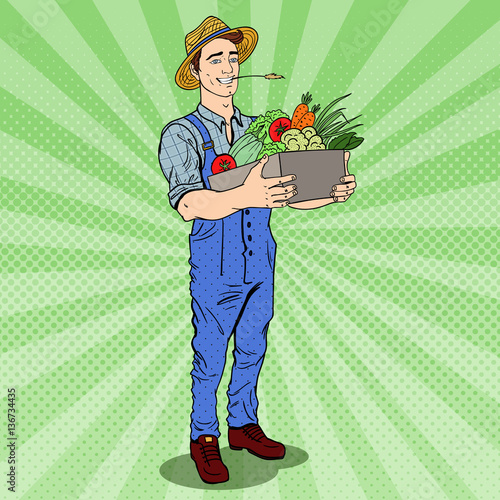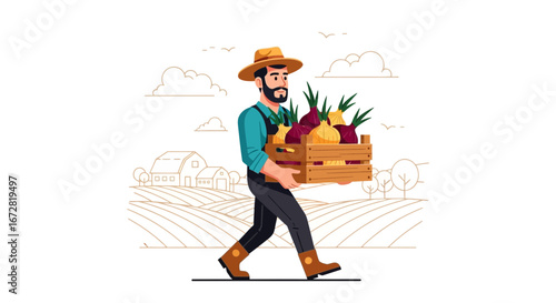 Happy man farmer character carrying wooden crate with ripe fuit or vegetable vector icon isolated on white background.
