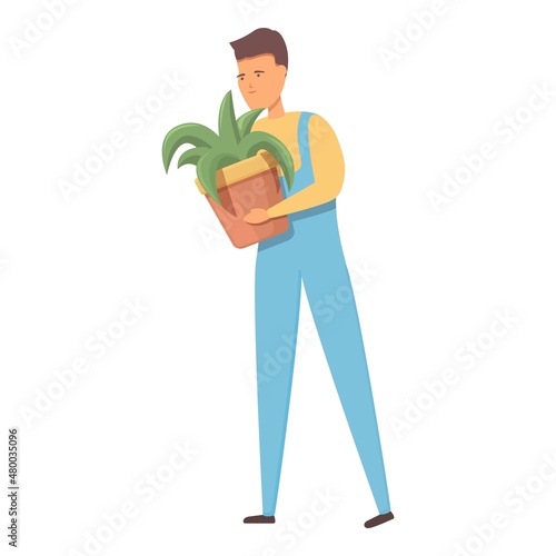 Happy man gardener carrying crate with ripe pear fruit vector icon isolated on white background.