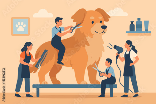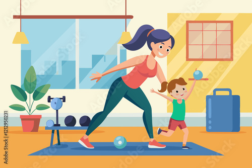 Happy mother playing with son and pet dog at home, flat vector illustration. Mom and kid spending time together. Parent child relationship, happy motherhood and parenting.