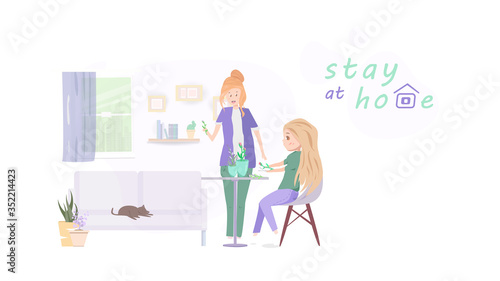 Vector flat illustration of young woman sitting in armchair with kid on her knees, crib and cat lying on floor. Happy motherhood, baby care concept for web banner, website page etc.
