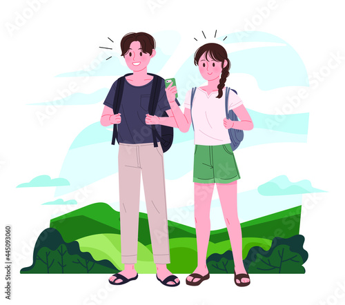 Happy woman walking in the park with her kids, vector illustration in paper art craft style. Young mother holding her son hand and pushing baby carriage. Happy Mothers Day card, poster, banner etc.