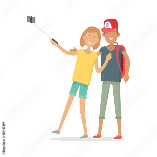 Happy multiethnic couple selfie photo by mobile phone camera vector illustration. Young hipster family picture made on smartphone. Man and woman portrait