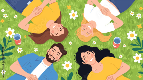 Happy multiracial family lying on a grass in park. Multicultural family concept vector illustration. Black woman and white man with two mixed kids. Summer family time.