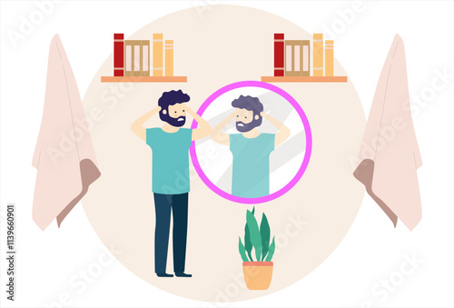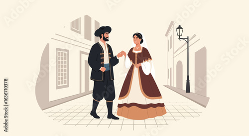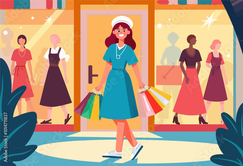 Happy muslim girl shopping in women clothing store, flat vector illustration. Young arab woman wearing traditional clothing and hijab choosing modern dress with shop assistant in fashion boutique.