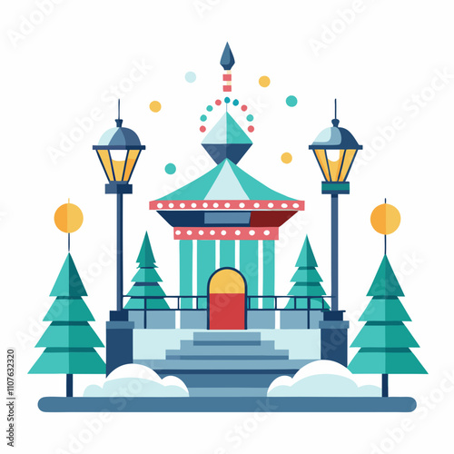 Happy new year and merry Christmas vector background. 3d isometric snowman, decorated xmas tree with glowing star, bauble ornament and candy cane treats design illustration