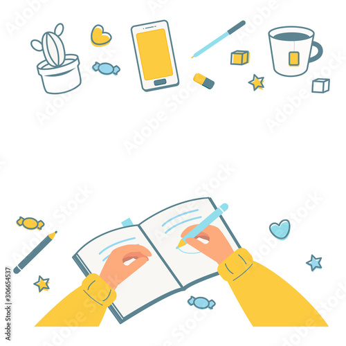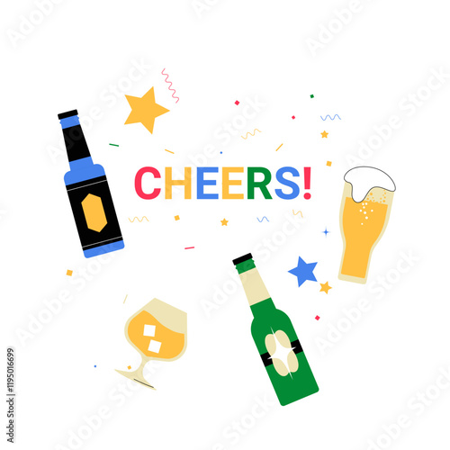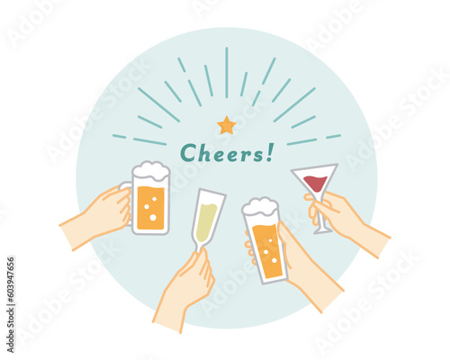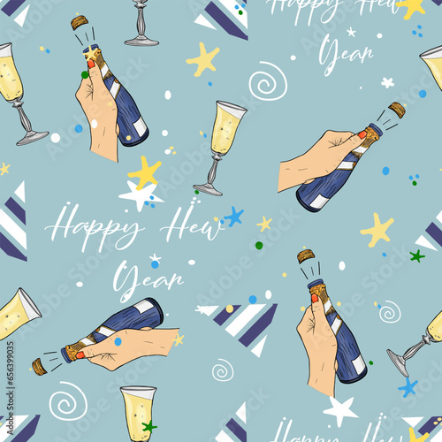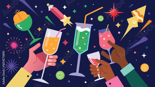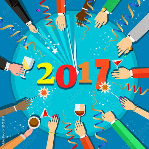 Happy New Year greeting card with human hands holding champagne glasses, fireworks and sparkler over festive vector illustration background