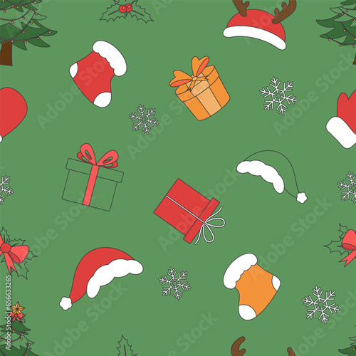 Happy New Year vector flat style design illustration. Santa hat, white beard and mustache, candles, glass of milk with cookies, candy canes, pen and letter to Santa Claus.