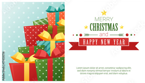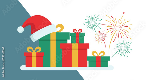 Happy New Year vector flat style design illustration. Santa hat, beard and mustache, gift boxes, christmas stocking, tree, candles, star. Winter holidays composition for web banner, website page etc.