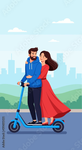 Happy parent walking baby in stroller vector illustration. Young father and mother character with newborn in park. Babysitting and parenthood, family and bonding