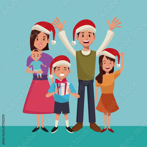 People celebrating Christmas party, flat vector isolated illustration. Family characters adults and kids, colleagues, friends dancing and having fun. Winter holidays celebration.