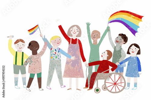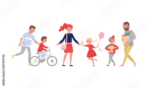 People celebrating Christmas party, flat vector isolated illustration. Family characters adults and kids, colleagues, friends dancing and having fun. Winter holidays celebration.