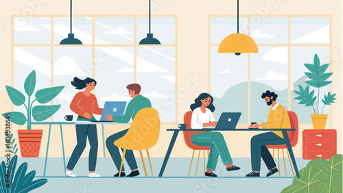 Happy people celebrating Easter at home, flat vector illustration. Family characters welcoming guests. Spring holiday celebration with friends and traditional Easter cake and painted eggs.