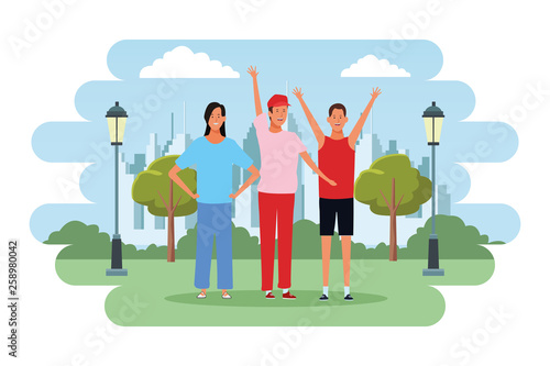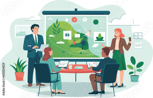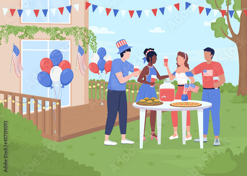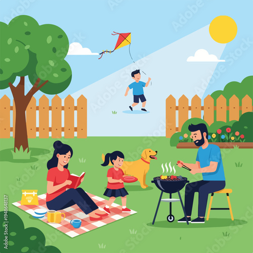 Summer hiking and bbq. Happy people reading books while lying in hammock and on blanket, grilling sausages, flat vector illustration. Barbecue party, outdoor picnic, camper van travel, summer camp.