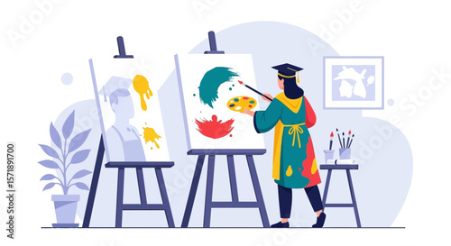Happy male and female cartoon characters making cute snowman, playing snowballs and having fun, flat vector illustration. Winter time outdoor activities. New Year and Christmas winter holidays.